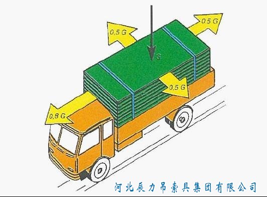 4.在垂直方向上,由于顛簸,所載貨物有一個向上或向下的作用力,此作用力為所載貨物重量的0.8倍。阻擋這些作用力,必須使所載貨物與承載面有足夠的摩擦力。而貨物如果沒有外界作用力,光靠貨物本身的重量所產生的摩擦力是遠遠不夠的。必須用捆綁工具,使貨物與承載面足夠的摩擦力,或拉住貨物。比如一個10噸的貨物,當摩擦系數為0.3時,僅可產生3噸的摩擦力。而當運輸工具急剎車時,此貨物有8噸的向前沖力。因此,另外5噸力必須通過捆綁工具來達到。